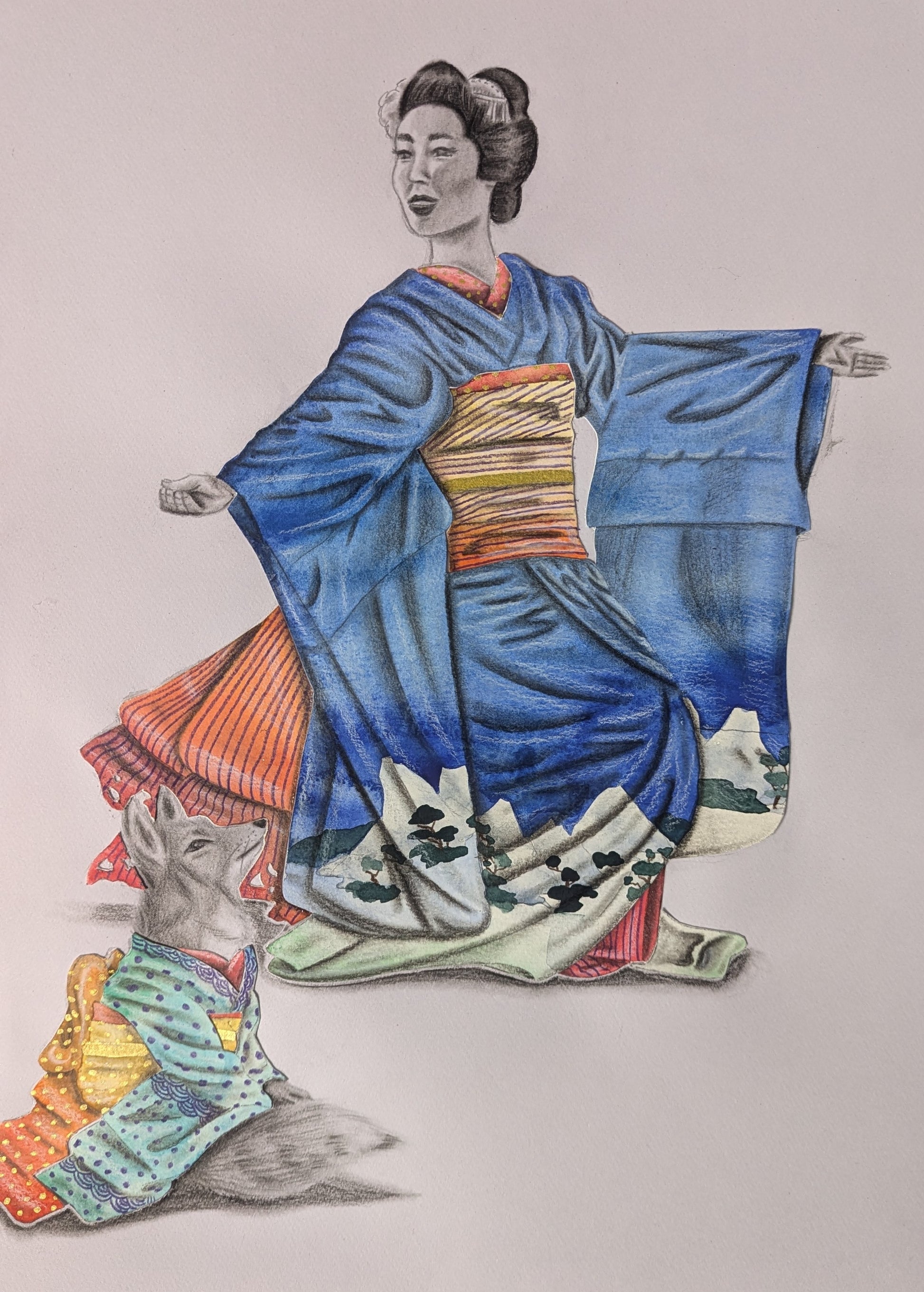 A 12x18 inch multi media piece, the characters were done in charcoal and graphite on drawing paper while their clothes were done separately in watercolour and pencil crayon on watercolour paper and pasted onto the drawing paper.